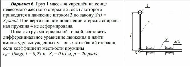 Вариант 6. Груз 1 массы m укреплён на конце невесомого жесткого стержня 2, ось O которого приводится в движение штоком 3 по закону S(t) = S0·sinpt. При вертикальном положении стержня спиральная пружина 4 не деформирована. Полагая груз материальной точкой, составить дифференциальное уравнение движения и найти амплитуду вынужденных угловых колебаний стержня, если коэффициент жесткости пружины cп= 10mgl, l = 0,98 м, S0 = 0,01 м, p = 20 рад/с.