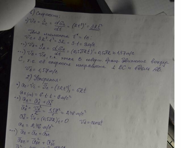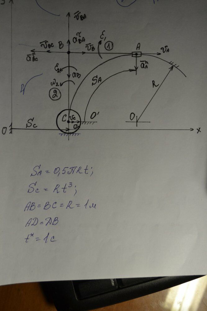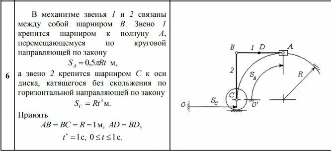 В механизме звенья 1 и 2 связаны между собой шарниром В. Звено 1 крепится шарниром к ползуну А, перемещающемуся по круговой направляющей по закону S Rt A 0,5 м, а звено 2 крепится шарниром С к оси диска, катящегося без скольжения по горизонтальной направляющей по закону 3 S Rt C м. Принять AB BC R 1 м, AD BD, 1 t с, 0 t 1 с.