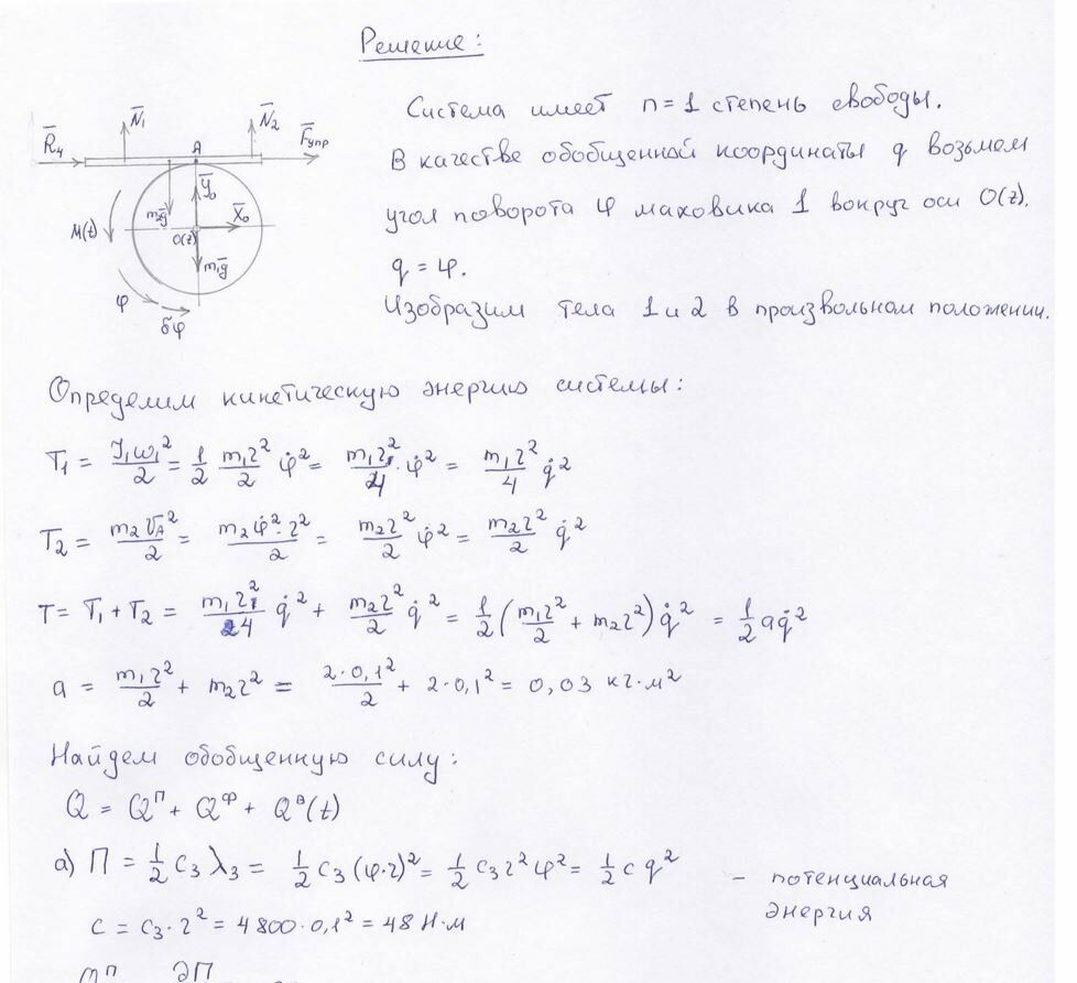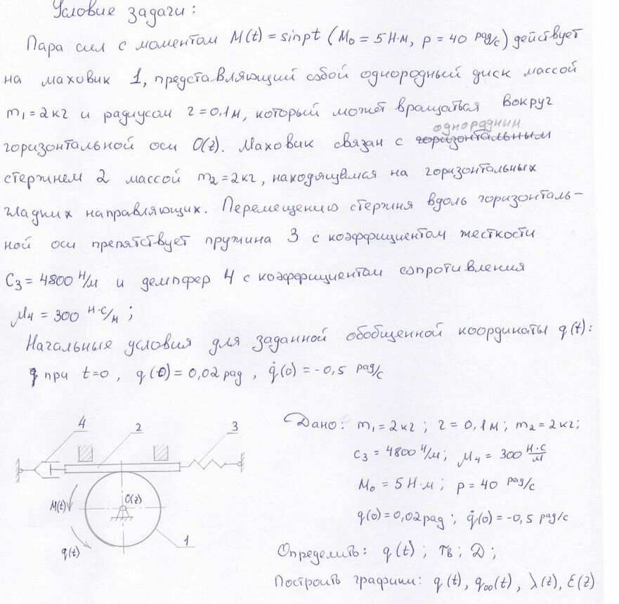 Вариант 7. Зубчатая рейка 1 массы m1 может двигаться в горизонтальных направляющих и находится в зацеплении с шестернёй 2 массы m2. Полагая шестерню однородным диском, составить дифференциальное уравнение движения и найти амплитуду вынужденных колебаний рейки, возбуждаемых парой сил, приложенных к шестерне, с моментом M(t)=M0·sinpt, если m1= m2 = 2 кг, коэффициент жёсткости пружины 3 r = 0,1 м, M0 = 5Н м, p =40 рад/с.