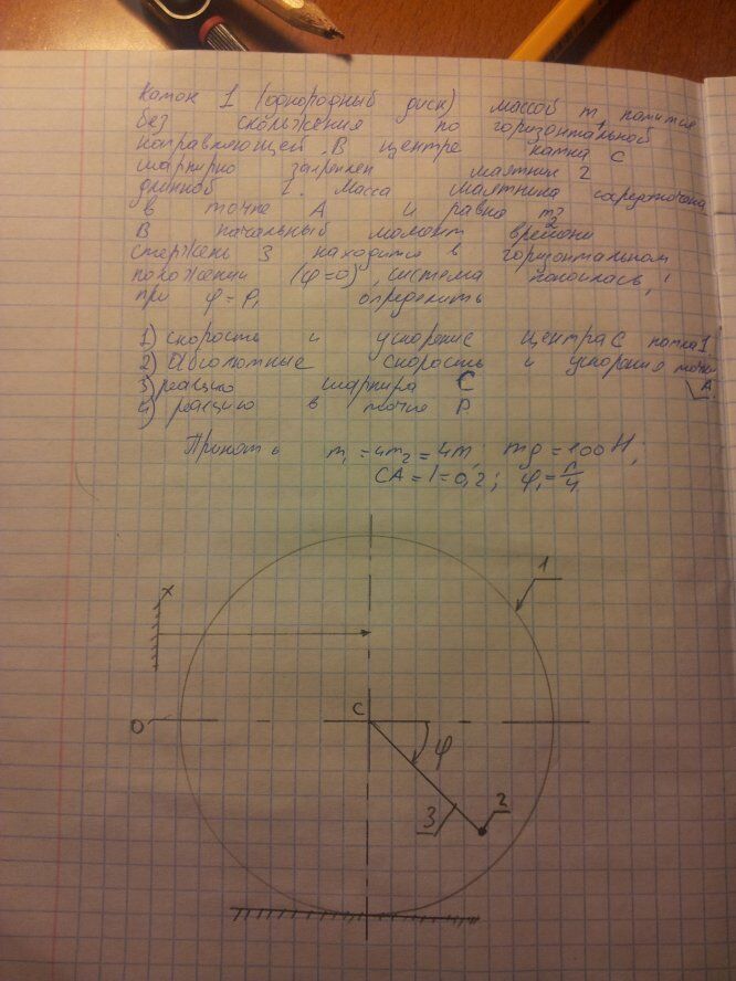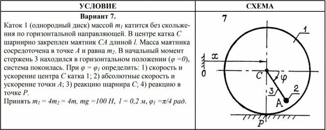 Вариант 7. Каток 1 (однородный диск) массой т1 катится без скольжения по горизонтальной направляющей. В центре катка С шарнирно закреплен маятник CA длиной l. Масса маятника сосредоточена в точке А и равна т2. В начальный момент стержень 3 находился в горизонтальном положении (φ =0), система покоилась. При φ = φ1 определить: 1) скорость и ускорение центра С катка 1; 2) абсолютные скорость и ускорение точки А; 3) реакцию шарнира С; 4) реакцию в точке Р. Принять т1 = 4т2 = 4т, mg =100 Н, l = 0,2 м, φ1 =π/4 рад.