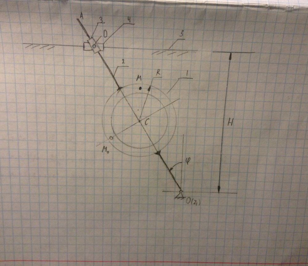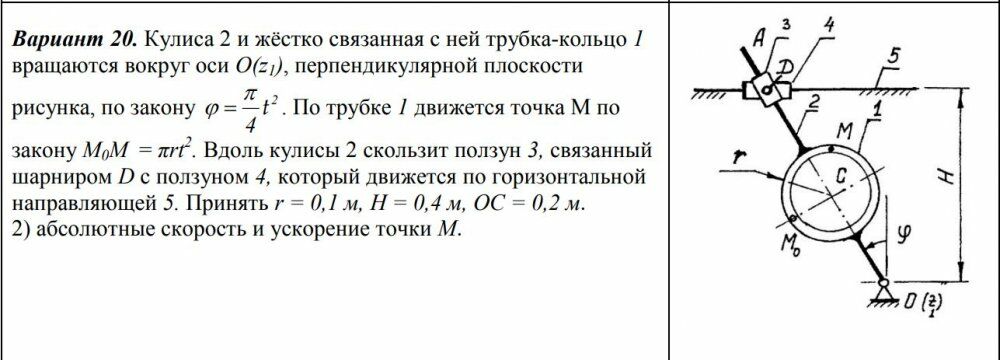 Вариант 20. Кулиса 2 и жёстко связанная с ней трубка-кольцо 1 вращаются вокруг оси O(z1), перпендикулярной плоскости рисунка, по закону 2 4 t . По трубке 1 движется точка М по закону M0M = πrt2 . Вдоль кулисы 2 скользит ползун 3, связанный шарниром D с ползуном 4, который движется по горизонтальной направляющей 5. Принять r = 0,1 м, H = 0,4 м, ОС = 0,2 м. 2) абсолютные скорость и ускорение точки M.