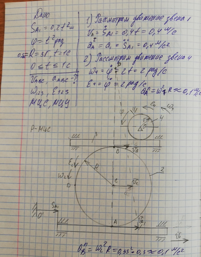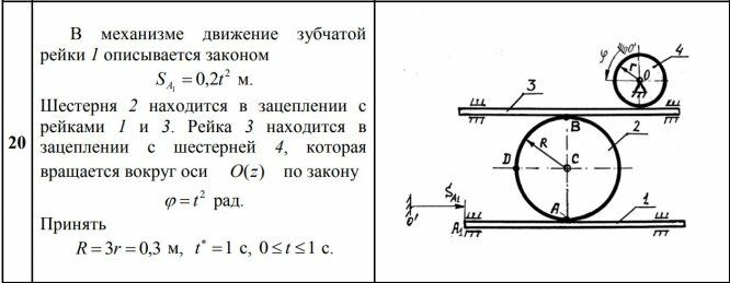 В механизме движение зубчатой рейки 1 описывается законом 2 0,2 1 S t A м. Шестерня 2 находится в зацеплении с рейками 1 и 3. Рейка 3 находится в зацеплении с шестерней 4, которая вращается вокруг оси O(z) по закону 2 t рад. Принять R 3r 0,3 м, 1 t с, 0 t 1 с.