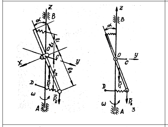 Угол α отклонения тела от вертикали и натяжение пружин. 2. Составляющие полных реакций (статические плюс динамические) подпятника A и подшипника B, то есть величины xA, yA, zA, xB, yB . (Пружины не напряжены при угле α = α°, значение которого приводятся в разделе II \"Исходные данные\") Вариант \"б\". При угле α = α° (то есть вместо пружин следует поставить жёсткий стержень) определить: 1. Составляющие динамических реакций подпятника А и подшипника B при заданном угле α. 2. Вес грузов PC, PD и PE (материальных точек), которые надо разместить в точках C, D и E крестовины так, чтобы динамические составляющие реакций подшипников были равны нулю, то есть, чтобы система была динамически уравновешена.