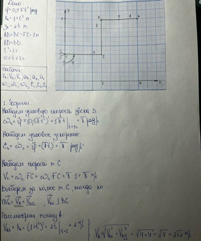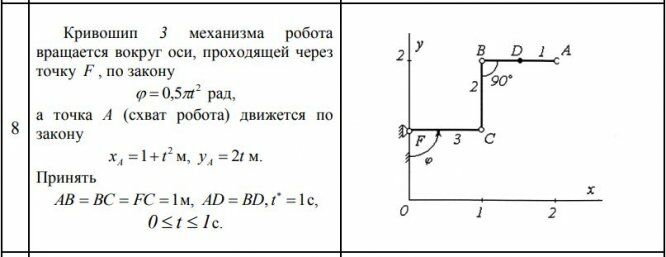 Кривошип 3 механизма робота вращается вокруг оси, проходящей через точку F , по закону 2 0,5t рад, а точка А (схват робота) движется по закону 2 x 1 t A м, y t A 2 м. Принять AB BC FC 1 м, , 1 AD BD t с, 0 t 1 с.