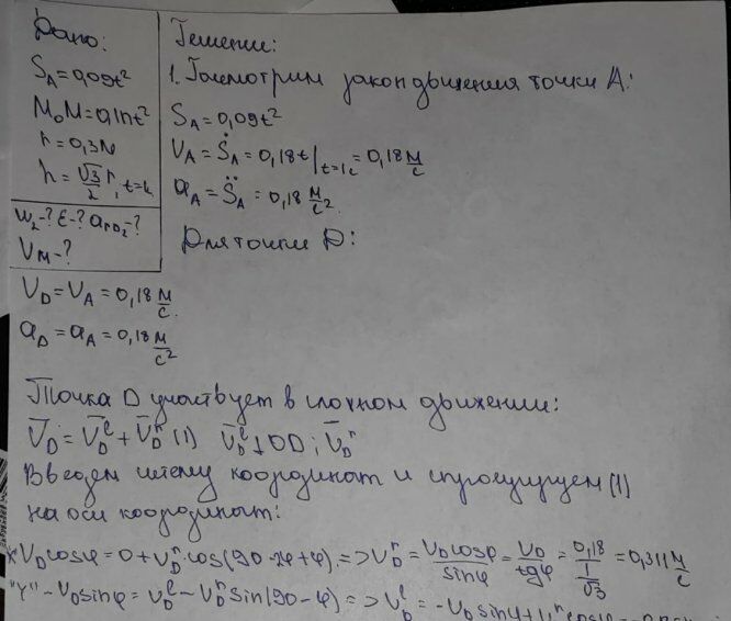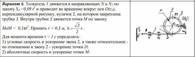 Вариант 6. Толкатель 1 движется в направляющих N и N1 по закону SA =0,09 t 2 и приводит во вращение вокруг оси O(z1), перпендикулярной рисунку, кулачок 2, на котором закреплена трубка 3. Внутри трубки 3 движется точка М по закону MоM = 0,1πt 2 . Принять r = 0,3 м, h r 2 3 . Для момента времени t = 1 c определить: 1) угловые скорость и ускорение звена 2, а также относительное - по отношению к звену 2 - ускорение точки D; 2) абсолютные скорость и ускорение точки M.