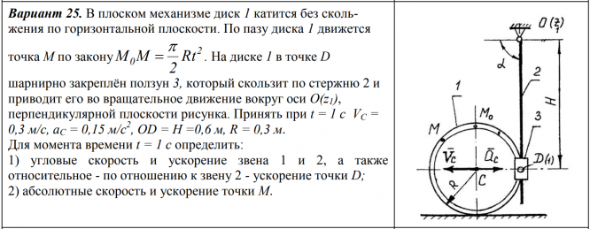В плоском механизме диск 1 катится без скольжения по горизонтальной плоскости. По пазу диска 1 движется точка М по закону 2 0 Rt 2 M M   . На диске 1 в точке D шарнирно закреплён ползун 3, который скользит по стержню 2 и приводит его во вращательное движение вокруг оси O(z1), перпендикулярной плоскости рисунка. Принять при t = 1 с VC = 0,3 м/с, aC = 0,15 м/с2 , OD = H =0,6 м, R = 0,3 м. Для момента времени t = 1 c определить: 1) угловые скорость и ускорение звена 1 и 2, а также относительное - по отношению к звену 2 - ускорение точки D; 2) абсолютные скорость и ускорение точки M.