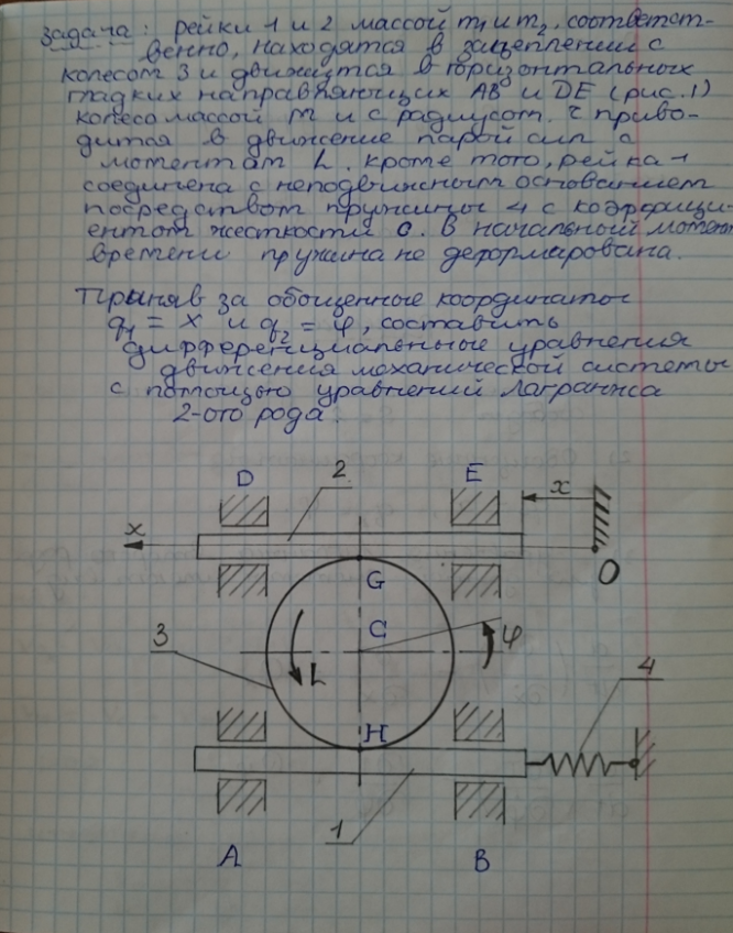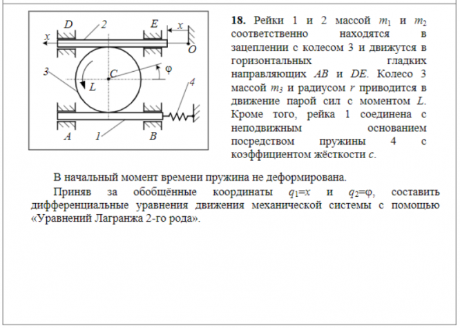 18. Рейки 1 и 2 массой m1 и m2 соответственно находятся в зацеплении с колесом 3 и движутся в горизонтальных гладких направляющих AB и DE. Колесо 3 массой m3 и радиусом r приводится в движение парой сил с моментом L. Кроме того, рейка 1 соединена с неподвижным основанием посредством пружины 4 с коэффициентом жёсткости с..