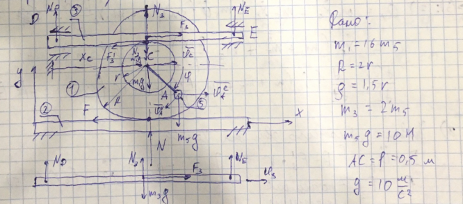 Механическая система состоит из ступенчатого зубчатого колеса 1 массой M1 и радиусом r, Ро радиус инерции колеса 1 относительно оси чертежа. Колесо 1 находится в зацеплении с неподвижной зубчатой рейкой 2 и подвижной зубчатой рейкой 3 массой m3. Рейка 3 движется поступательно в гладких опорах параллельных рейке 2. К центру 1 прикреплён маятник 4, масса точки А равна M5 AC = l. АС - невесомый. При t = 0 система покоилось, маятник был отклонен вправо и занимал горизонтальное положение. Затем его отпускают без начальной угловой скорости. Проскальзывание в закреплениях отсутствуют, трением качения и трением в шарнире C пренебречь. В момент когда маятник займёт вертикальное положение определить скорость центр С зубчатого колеса и угловую скорость маятника 4