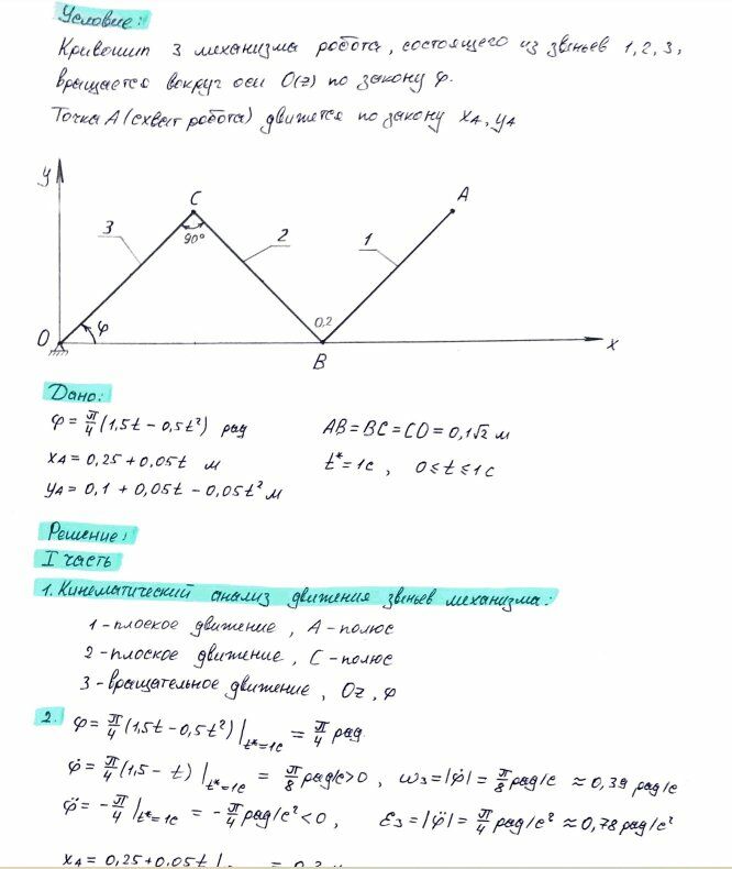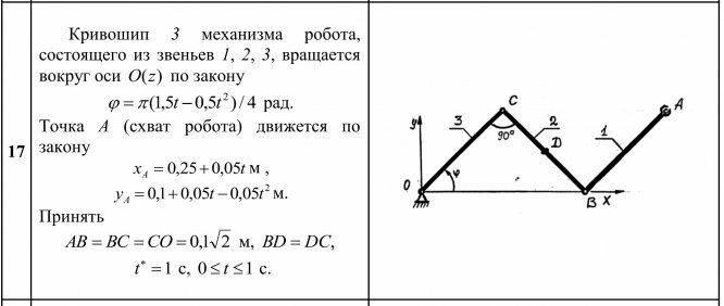 Кривошип 3 механизма робота, состоящего из звеньев 1, 2, 3, вращается вокруг оси O(z) по закону (1,5 0,5 )/ 4 2 t t рад. Точка А (схват робота) движется по закону x t A 0,250,05 м , 2 y 0,1 0,05t 0,05t A м. Принять AB BC CO 0,1 2 м, BD DC, 1 t с, 0 t 1 с.