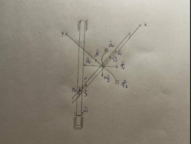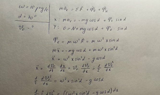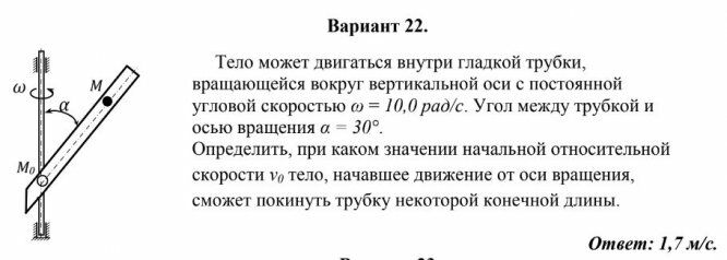 Тело может двигаться внутри гладкой трубки, вращающейся вокруг вертикальной оси с постоянной угловой скоростью ω = 10,0 рад/с. Угол между трубкой и осью вращения α = 30°. Определить, при каком значении начальной относительной скорости v0 тело, начавшее движение от оси вращения, сможет покинуть трубку некоторой конечной длины.