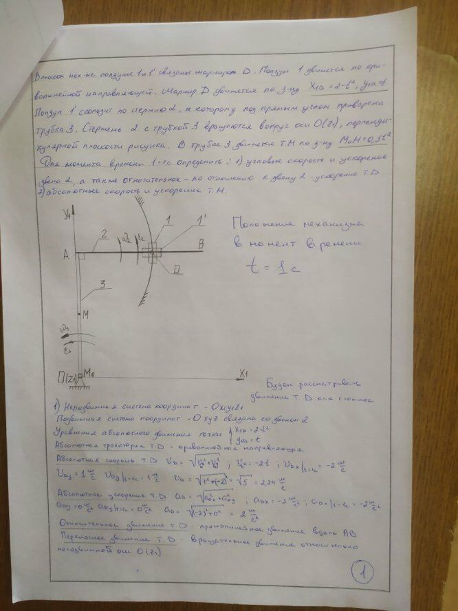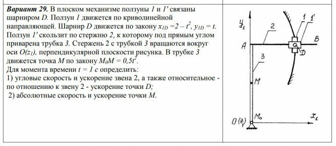 Вариант 29. В плоском механизме ползуны 1 и 1' связаны шарниром D. Ползун 1 движется по криволинейной направляющей. Шарнир D движется по закону x1D =2 – t 2 , y1D = t. Ползун 1' скользит по стержню 2, к которому под прямым углом приварена трубка 3. Стержень 2 с трубкой 3 вращаются вокруг оси O(z1), перпендикулярной плоскости рисунка. В трубке 3 движется точка М по закону М0М = 0,5t 2 . Для момента времени t = 1 c определить: 1) угловые скорость и ускорение звена 2, а также относительное - по отношению к звену 2 - ускорение точки D; 2) абсолютные скорость и ускорение точки M.