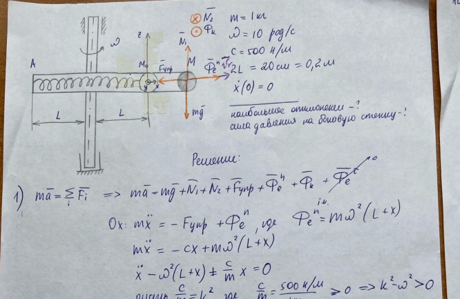 Тело массой m = 1,0 кг движется внутри гладкой трубки, вращающейся с постоянной угловой скоростью ω = 10,0 рад/с вокруг вертикальной оси. Тело связано с концом пружины АМ. Жесткость пружины с = 500,0 Н/м, её длина в недеформированном состоянии равна 2L = 20,0 см. Движение началось без начальной относительной скорости из положения, соответствующего недеформированной пружине.Определить наибольшее отклонение тела от оси вращения и максимальную величину силы давления на боковую стенку.