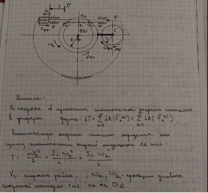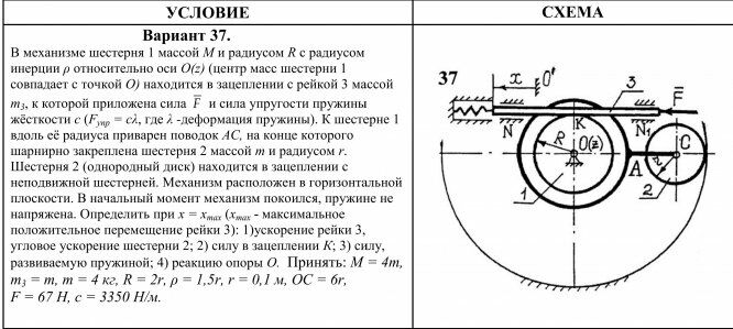 Вариант 37. В механизме шестерня 1 массой М и радиусом R с радиусом инерции ρ относительно оси O(z) (центр масс шестерни 1 совпадает с точкой О) находится в зацеплении с рейкой 3 массой m3, к которой приложена сила F и сила упругости пружины жёсткости с (Fупр = сλ, где λ -деформация пружины). К шестерне 1 вдоль её радиуса приварен поводок АС, на конце которого шарнирно закреплена шестерня 2 массой m и радиусом r. Шестерня 2 (однородный диск) находится в зацеплении с неподвижной шестерней. Механизм расположен в горизонтальной плоскости. В начальный момент механизм покоился, пружине не напряжена. Определить при х = хmax (хmax - максимальное положительное перемещение рейки 3): 1)ускорение рейки 3, угловое ускорение шестерни 2; 2) силу в зацеплении К; 3) силу, развиваемую пружиной; 4) реакцию опоры О. Принять: M = 4m, m3 = m, m = 4 кг, R = 2r, ρ = 1,5r, r = 0,1 м, OC = 6r, F = 67 Н, c = 3350 Н/м.