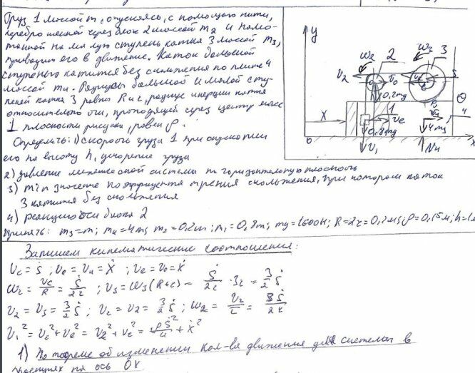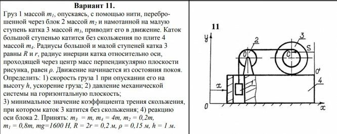 Вариант 11. Груз 1 массой m1, опускаясь, с помощью нити, переброшенной через блок 2 массой т2 и намотанной на малую ступень катка 3 массой m3, приводит его в движение. Каток большой ступенью катится без скольжения по плите 4 массой m4. Радиусы большой и малой ступеней катка 3 равны R и r, радиус инерции катка относительно оси, проходящей через центр масс перпендикулярно плоскости рисунка, равен ρ. Движение начинается из состояния покоя. Определить: 1) скорость груза 1 при опускании его на высоту h, ускорение груза; 2) давление механической системы на горизонтальную плоскость; 3) минимальное значение коэффициента трения скольжения, при котором каток 3 катится без скольжения; 4) реакцию оси блока 2. Принять: m3 = m, m4 = 4m, m2 = 0,2m, m1 = 0,8m, mg=1600 Н, R = 2r = 0,2 м, ρ = 0,15 м, h = 1 м.