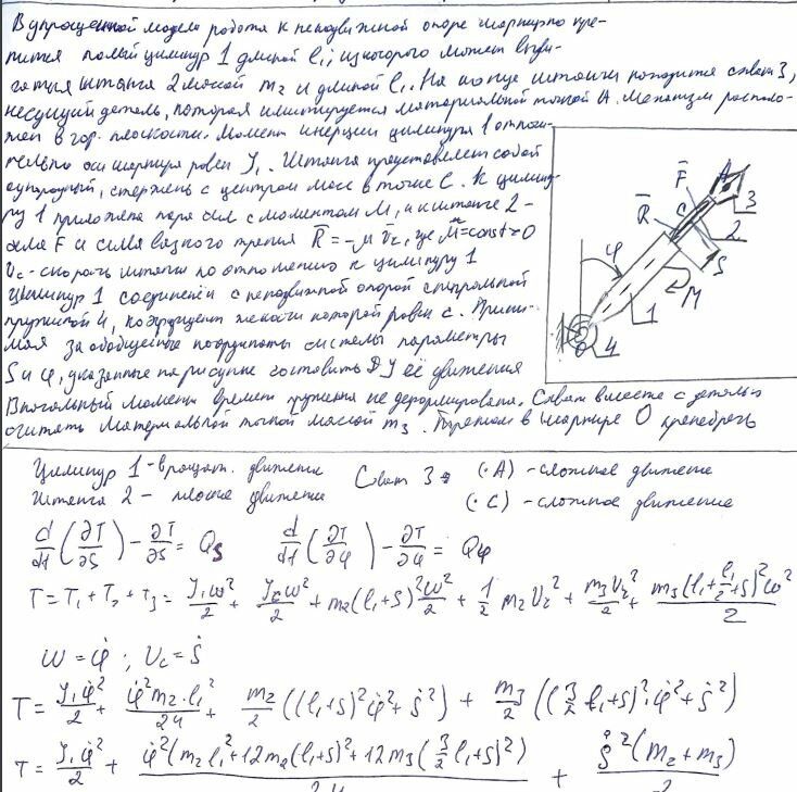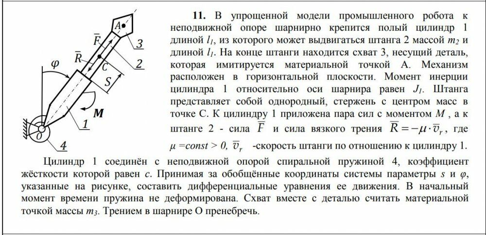 11. В упрощенной модели промышленного робота к неподвижной опоре шарнирно крепится полый цилиндр 1 длиной l1, из которого может выдвигаться штанга 2 массой m2 и длиной l1. На конце штанги находится схват 3, несущий деталь, которая имитируется материальной точкой A. Механизм расположен в горизонтальной плоскости. Момент инерции цилиндра 1 относительно оси шарнира равен J1. Штанга представляет собой однородный, стержень с центром масс в точке C. К цилиндру 1 приложена пара сил с моментом M , а к штанге 2 - сила F и сила вязкого трения R vr , где μ =const > 0, r v -скорость штанги по отношению к цилиндру 1. Цилиндр 1 соединён с неподвижной опорой спиральной пружиной 4, коэффициент жёсткости которой равен c. Принимая за обобщённые координаты системы параметры s и φ, указанные на рисунке, составить дифференциальные уравнения ее движения. В начальный момент времени пружина не деформирована. Схват вместе с деталью считать материальной точкой массы m3. Трением в шарнире O пренебречь.