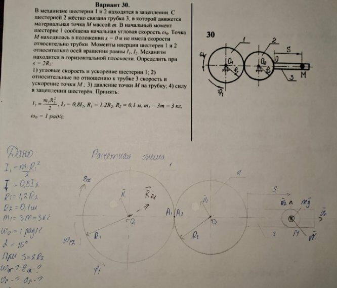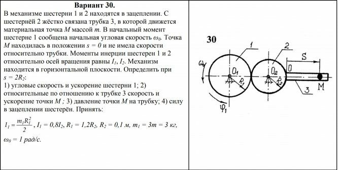 Вариант 30. В механизме шестерни 1 и 2 находятся в зацеплении. С шестернёй 2 жёстко связана трубка 3, в которой движется материальная точка М массой m. В начальный момент шестерне 1 сообщена начальная угловая скорость ω0. Точка М находилась в положении s = 0 и не имела скорости относительно трубки. Моменты инерции шестерен 1 и 2 относительно осей вращения равны I1, I2. Механизм находится в горизонтальной плоскости. Определить при s = 2R2: 1) угловые скорость и ускорение шестерни 1; 2) относительные по отношению к трубке 3 скорость и ускорение точки М ; 3) давление точки М на трубку; 4) силу в зацеплении шестерён. Принять: 2 2 1 1 1 m R I , I1 = 0,8I2, R1 = 1,2R2, R2 = 0,1 м, m1 = 3m = 3 кг, ω0 = 1 рад/с.