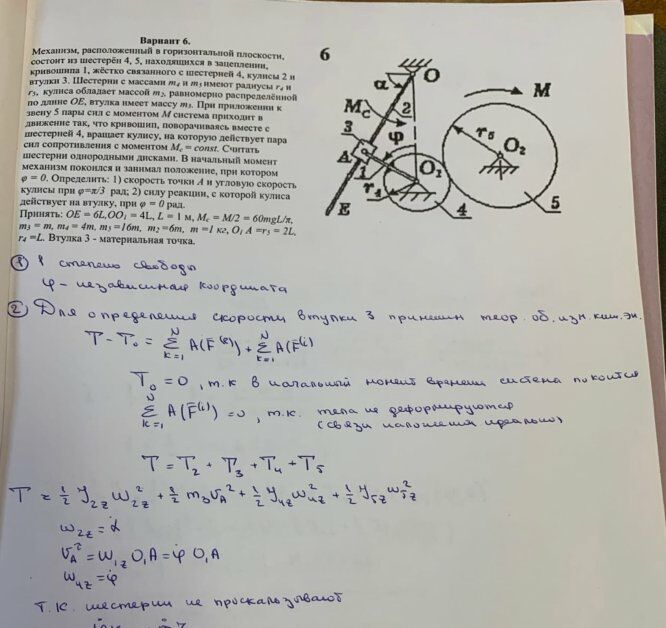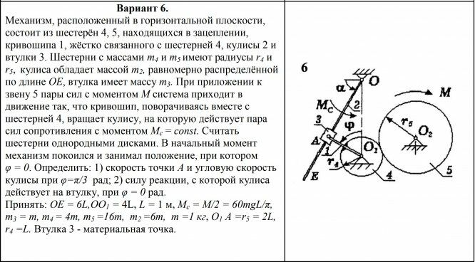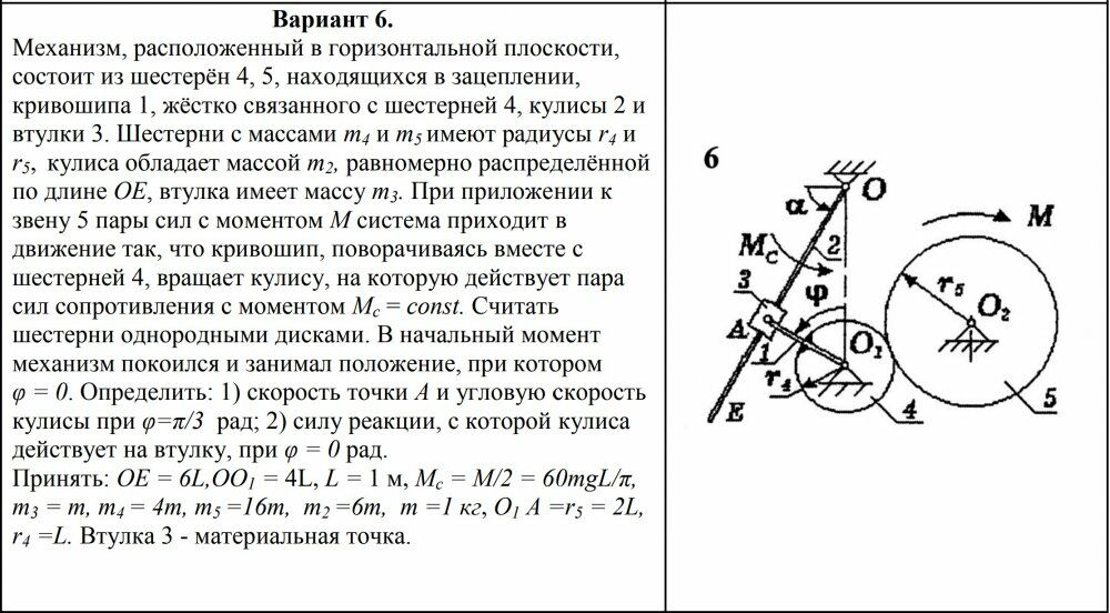 Вариант 6. Механизм, расположенный в горизонтальной плоскости, состоит из шестерён 4, 5, находящихся в зацеплении, кривошипа 1, жёстко связанного с шестерней 4, кулисы 2 и втулки 3. Шестерни с массами т4 и т5 имеют радиусы r4 и r5, кулиса обладает массой т2, равномерно распределённой по длине ОЕ, втулка имеет массу т3. При приложении к звену 5 пары сил с моментом М система приходит в движение так, что кривошип, поворачиваясь вместе с шестерней 4, вращает кулису, на которую действует пара сил сопротивления с моментом Мс = сопst. Считать шестерни однородными дисками. В начальный момент механизм покоился и занимал положение, при котором φ = 0. Определить: 1) скорость точки А и угловую скорость кулисы при φ=π/3 рад; 2) силу реакции, с которой кулиса действует на втулку, при φ = 0 рад. Принять: ОЕ = 6L,OO1 = 4L, L = 1 м, Мc = М/2 = 60тgL/π, т3 = m, т4 = 4m, т5 =16m, m2 =6m, m =1 кг, О1 А =r5 = 2L, r4 =L. Втулка 3 - материальная точка.э