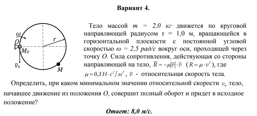 Тело массой m = 2,0 кг движется по круговой направляющей радиусом r = 1,0 м, вращающейся в горизонтальной плоскости с постоянной угловой скоростью ω = 2,5 рад/с вокруг оси, проходящей через точку О. Сила сопротивления, действующая со стороны направляющей на тело, R v v ( 2 R v ), где 2 2 0,3Н с м , v - относительная скорость тела. Определить, при каком минимальном значении относительной скорости 0 v тело, начавшее движение из положения O, совершит полный оборот и придет в исходное положение? Ответ: 8,0 м/с.