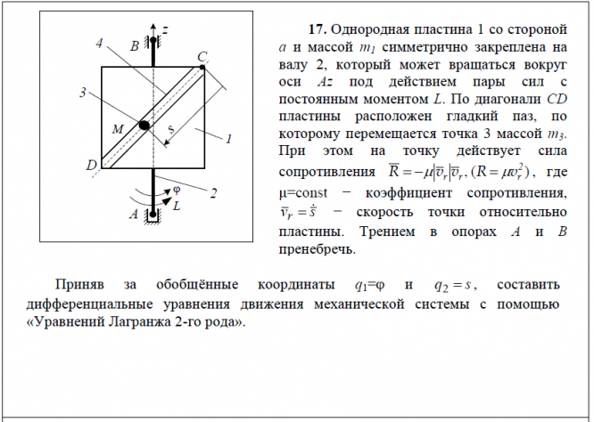 17. Однородная пластина 1 со стороной a и массой m1 симметрично закреплена на валу 2, который может вращаться вокруг оси Az под действием пары сил с постоянным моментом L. По диагонали CD пластины расположен гладкий паз, по которому перемещается точка 3 массой m3. При этом на точку действует сила сопротивления , ( ) 2 r r r R   v v R v , где μ=const − коэффициент сопротивления, vr s   − скорость точки относительно пластины. Трением в опорах A и B пренебречь. В начальный момент времени пружина не деформирована. Приняв за обобщённые координаты q1=x и q2=, составить дифференциальные уравнения движения механической системы с помощью «Уравнений Лагранжа 2-го рода».