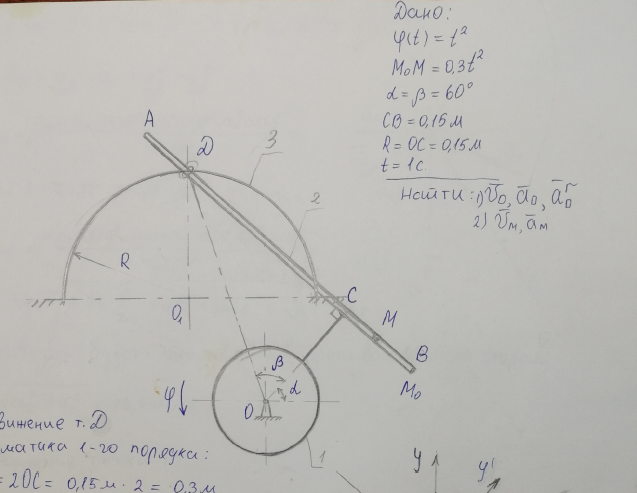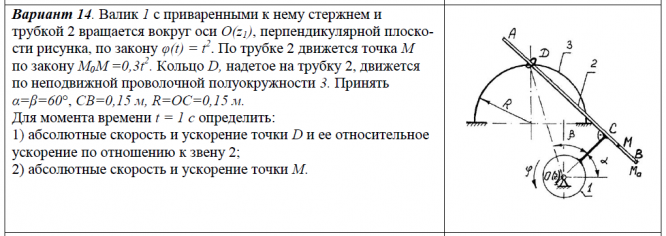 Вариант 14. Валик 1 с приваренными к нему стержнем и трубкой 2 вращается вокруг оси O(z1), перпендикулярной плоско- сти рисунка, по закону φ(t) = t2. По трубке 2 движется точка М по закону М0М =0,3t2. Кольцо D, надетое на трубку 2, движется по неподвижной проволочной полуокружности 3. Принять α=β=60°, CB=0,15 м, R=ОС=0,15 м. Для момента времени t = 1 c определить: 1) абсолютные скорость и ускорение точки D и ее относительное ускорение по отношению к звену 2; 2) абсолютные скорость и ускорение точки M..