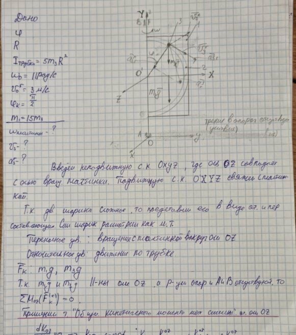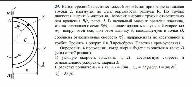 24. На однородной пластине1 массой m1 жёстко прикреплена гладкая трубка 2, изогнутая по дуге окружности радиуса R. По трубке движется шарик 3 массой m3. Момент инерции трубки относительно оси вращения B(z) равен I. В начальный момент времени пластина, жёстко связанная с осью B(z), начинает вращаться с угловой скоростью ω0 вокруг этой оси, при этом шарику 3, находящемуся в точке O, сообщена относительная скорость r v0 , направленная по касательной к трубке. Трением в опорах A и B пренебречь. Пластина прямоугольная. Определить в положении, когда шарик будет находиться в точке D (угол φ=π/2 радиан): 1) угловую скорость пластины 1; 2) абсолютную скорость и относительное ускорение шарика 3. В расчётах принять: m3 = 1 кг, m1 = 15m3, ω0 = 11 рад/с, I = 5m3R 2 , v м с r 0 3 .