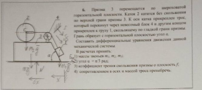 6. Призма 3 перемещается по шероховатой горизонтальной плоскости. Каток 2 катится без скольжения по верхней грани призмы 3. К оси катка прикреплен трос, который перекинут через невесомый блок 4 и другим концом прикреплен к грузу 1, скользящему по гладкой грани призмы. Грань образует с горизонтальной плоскостью угол α. Составить дифференциальные уравнения движения данной механической системы. В расчетах принять: 1) массы звеньев m1, m2, m3; 2) угол α = π/3 рад; 3) коэффициент трения скольжения призмы о плоскость f; 4) сопротивлением в осях и массой троса пренебречь.