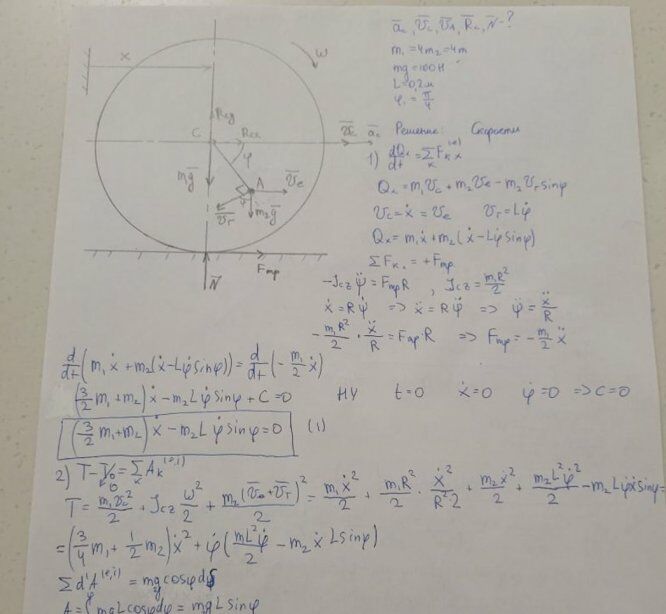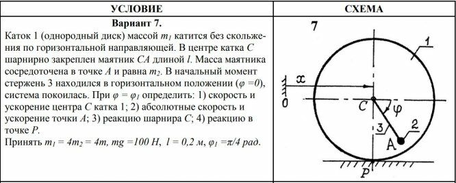 Вариант 7. Каток 1 (однородный диск) массой т1 катится без скольжения по горизонтальной направляющей. В центре катка С шарнирно закреплен маятник CA длиной l. Масса маятника сосредоточена в точке А и равна т2. В начальный момент стержень 3 находился в горизонтальном положении (φ =0), система покоилась. При φ = φ1 определить: 1) скорость и ускорение центра С катка 1; 2) абсолютные скорость и ускорение точки А; 3) реакцию шарнира С; 4) реакцию в точке Р. Принять т1 = 4т2 = 4т, mg =100 Н, l = 0,2 м, φ1 =π/4 рад.
