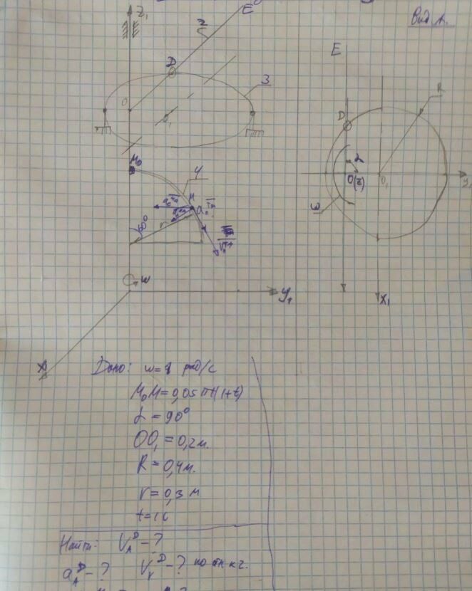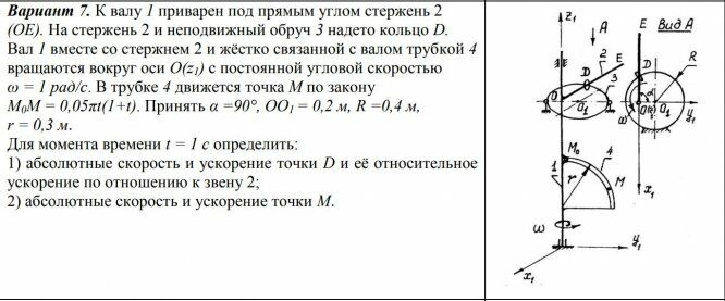 Вариант 7. К валу 1 приварен под прямым углом стержень 2 (ОЕ). На стержень 2 и неподвижный обруч 3 надето кольцо D. Вал 1 вместе со стержнем 2 и жёстко связанной с валом трубкой 4 вращаются вокруг оси O(z1) с постоянной угловой скоростью ω = 1 рад/с. В трубке 4 движется точка М по закону M0M = 0,05πt(1+t). Принять α =90°, OO1 = 0,2 м, R =0,4 м, r = 0,3 м. Для момента времени t = 1 c определить: 1) абсолютные скорость и ускорение точки D и её относительное ускорение по отношению к звену 2; 2) абсолютные скорость и ускорение точки M.