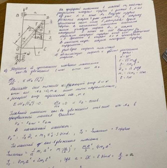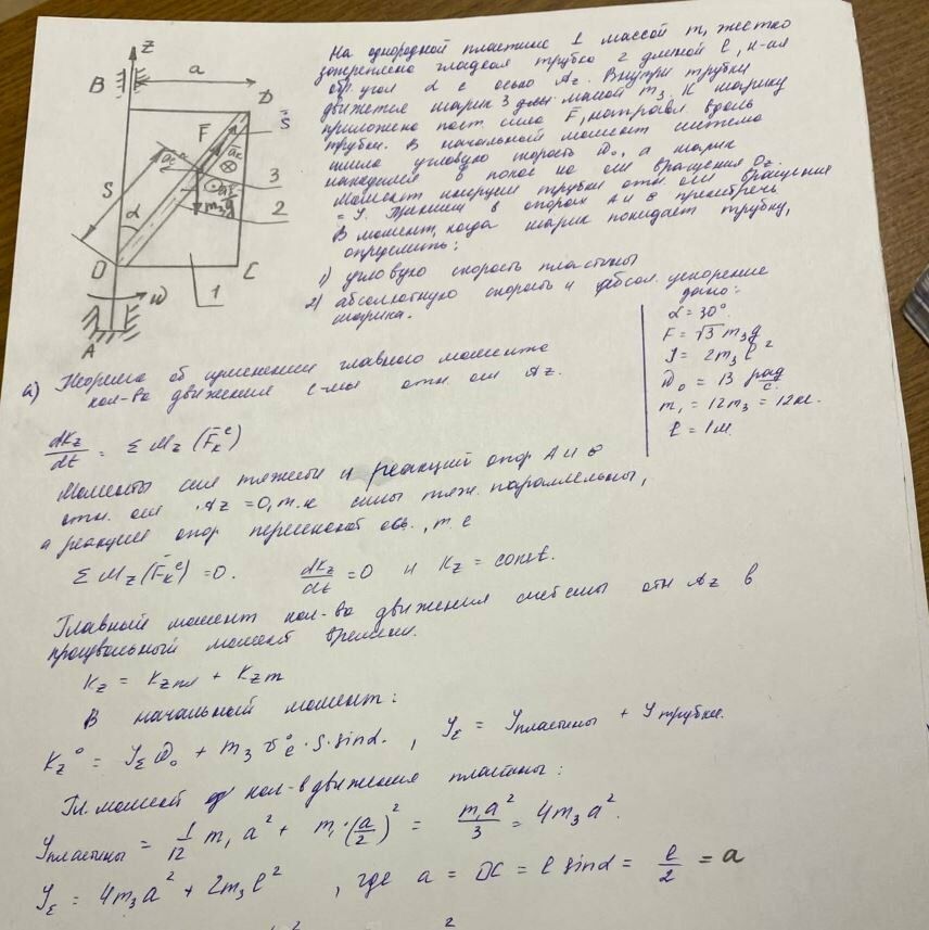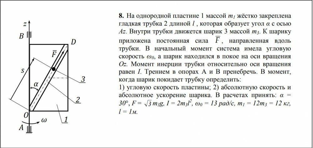 8. На однородной пластине 1 массой m1 жёстко закреплена гладкая трубка 2 длиной l , которая образует угол α с осью Az. Внутри трубки движется шарик 3 массой m3. К шарику приложена постоянная сила F , направленная вдоль трубки. В начальный момент система имела угловую скорость ω0, а шарик находился в покое на оси вращения Oz. Момент инерции трубки относительно оси вращения равен I. Трением в опорах A и B пренебречь. В момент, когда шарик покидает трубку определить: 1) угловую скорость пластины; 2) абсолютную скорость и абсолютное ускорение шарика. В расчетах принять: α = 30°, F = 3 m3g, I = 2m3l 2 , ω0 = 13 рад/с, m1 = 12m3 = 12 кг, l = 1м.