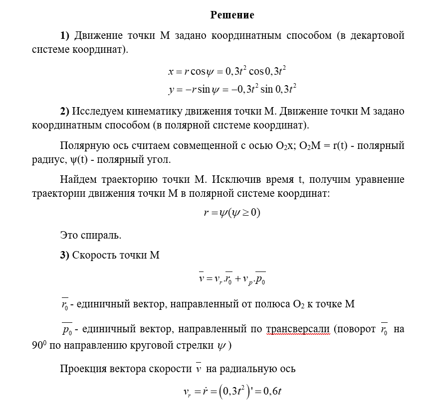 6) найти радиальные и трансверсальные составляющие скорости и ускорения точки M. Начало полярной системы координат нужно поместить в начало декартовой, направив полярную ось по оси Ox;