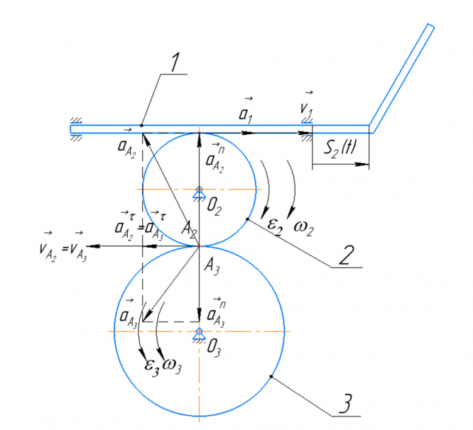 2) определить угловые скорости и угловые ускорения звеньев механизма, совершающих вращательное движение, указав на чертеже круговыми стрелками их направления, определить характер движения тел (замедленный или ускоренный);
