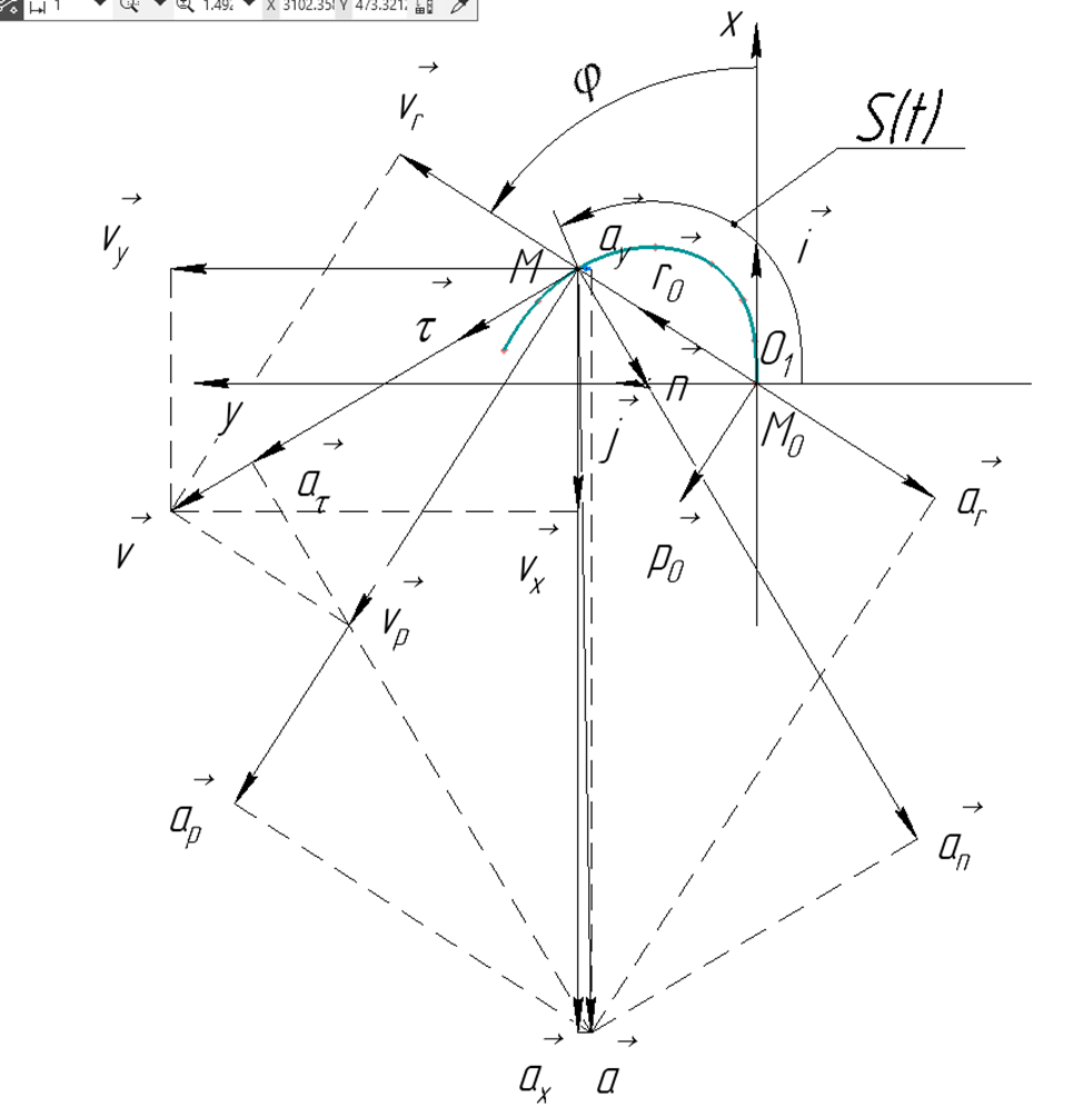 7) в выбранном масштабе выполнить чертеж с изображением траектории движения точки M. На чертеже указать все составляющие скорости и ускорения точки M в момент времени
