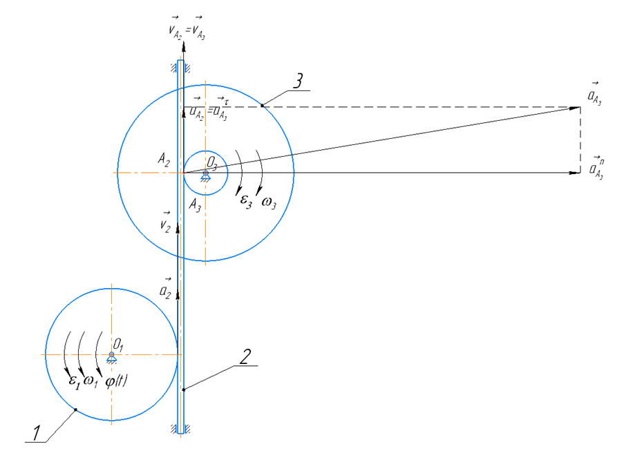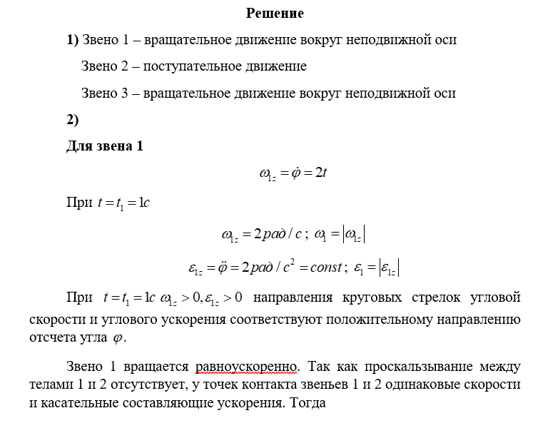 2) определить угловые скорости и угловые ускорения звеньев механизма, совершающих вращательное движение, указав на чертеже круговыми стрелками их направления, определить характер движения тел (замедленный или ускоренный);