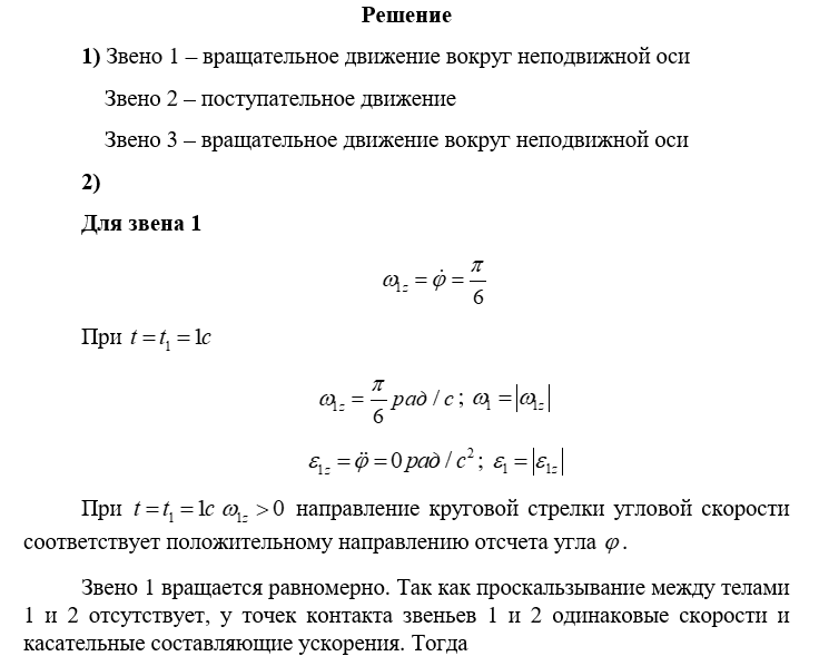 2) определить угловые скорости и угловые ускорения звеньев механизма, совершающих вращательное движение, указав на чертеже круговыми стрелками их направления, определить характер движения тел (замедленный или ускоренный);