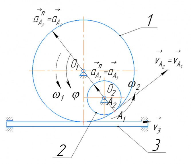 4) для точек контакта тел Ai (i - номер звена) определить скорости, ускорения и изобразить их на схеме механизма в соответствующем масштабе (см.разд. 4).