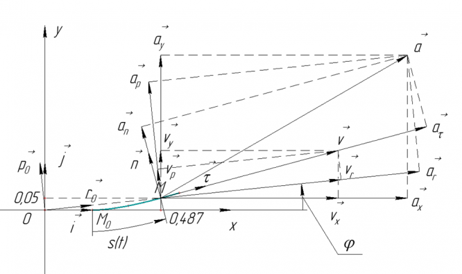 7) в выбранном масштабе выполнить чертеж с изображением траектории движения точки M. На чертеже указать все составляющие скорости и ускорения точки M в момент времени