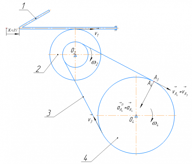 4) для точек контакта тел Ai (i - номер звена) определить скорости, ускорения и изобразить их на схеме механизма в соответствующем масштабе (см.разд. 4).