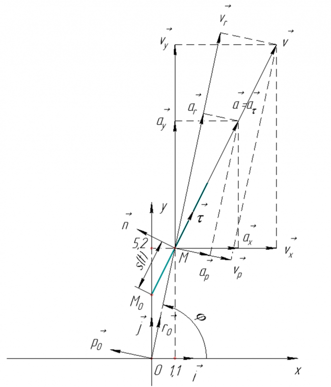 7) в выбранном масштабе выполнить чертеж с изображением траектории движения точки M. На чертеже указать все составляющие скорости и ускорения точки M в момент времени