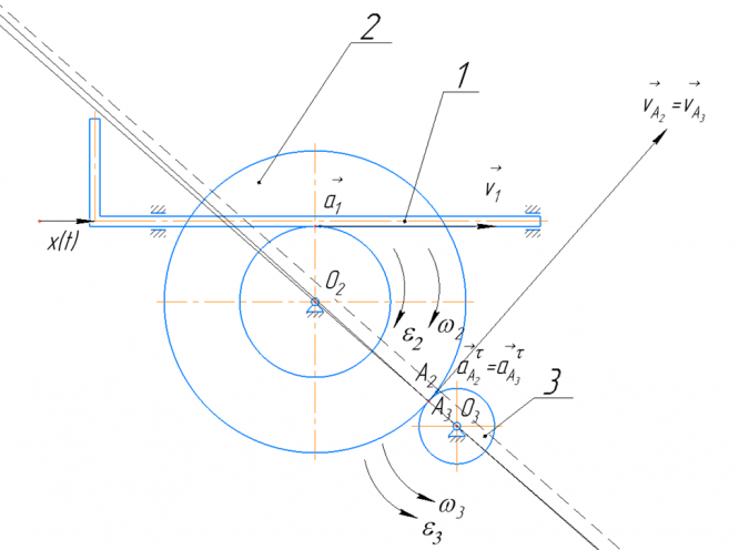 2) определить угловые скорости и угловые ускорения звеньев механизма, совершающих вращательное движение, указав на чертеже круговыми стрелками их направления, определить характер движения тел (замедленный или ускоренный);