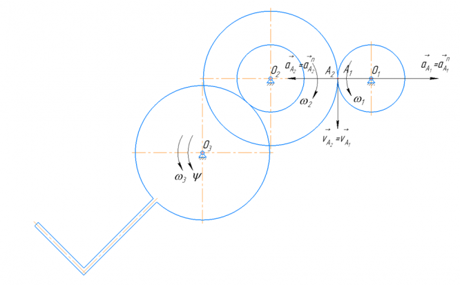 4) для точек контакта тел Ai (i - номер звена) определить скорости, ускорения и изобразить их на схеме механизма в соответствующем масштабе (см.разд. 4).