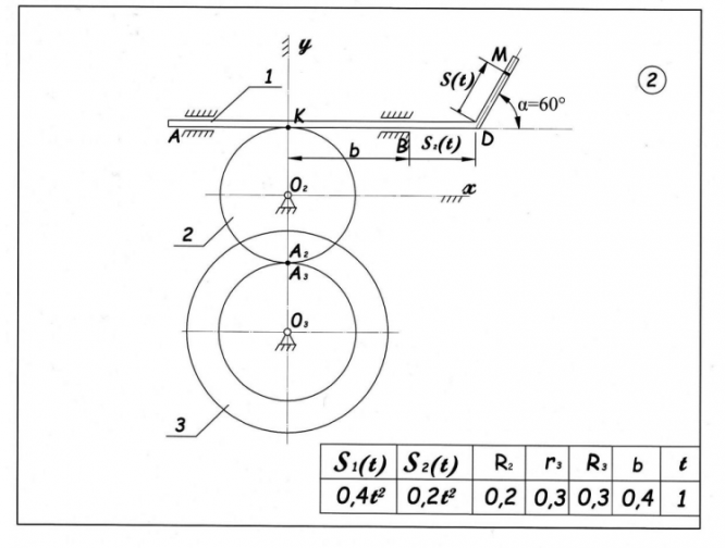 Начало полярной системы координат нужно поместить в начало декартовой, направив полярную ось по оси Ox ; 7) в выбранном масштабе выполнить чертеж с изображением траектории движения точки M . На чертеже указать все составляющие скорости и ускорения точки M в момент времени  КИНЕМАТИКА ПРОСТЕЙШИХ ДВИЖЕНИЙ ТВЕРДОГО ТЕЛА Во второй части курсового задания требуется: 1) установить вид движения звеньев механизма  д ля момента времени    ; 2) определить угловые скорости     и угловые ускорения      звеньев   механизма, совершающих вращательное движение, указав на чертеже   круговыми стрелками их направления, определить характер движения тел (замедленный или ускоренный); 3) определить скорости v и ускорения a тел при поступательном   движении; 4) для точек контакта тел     (i - номер звена) определить скорости,   ускорения и изобразить их на схеме механизма в соответствующем масштабе  .