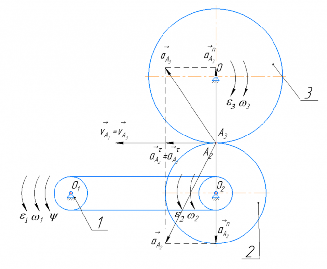 4) для точек контакта тел Ai (i - номер звена) определить скорости, ускорения и изобразить их на схеме механизма в соответствующем масштабе (см.разд. 4).