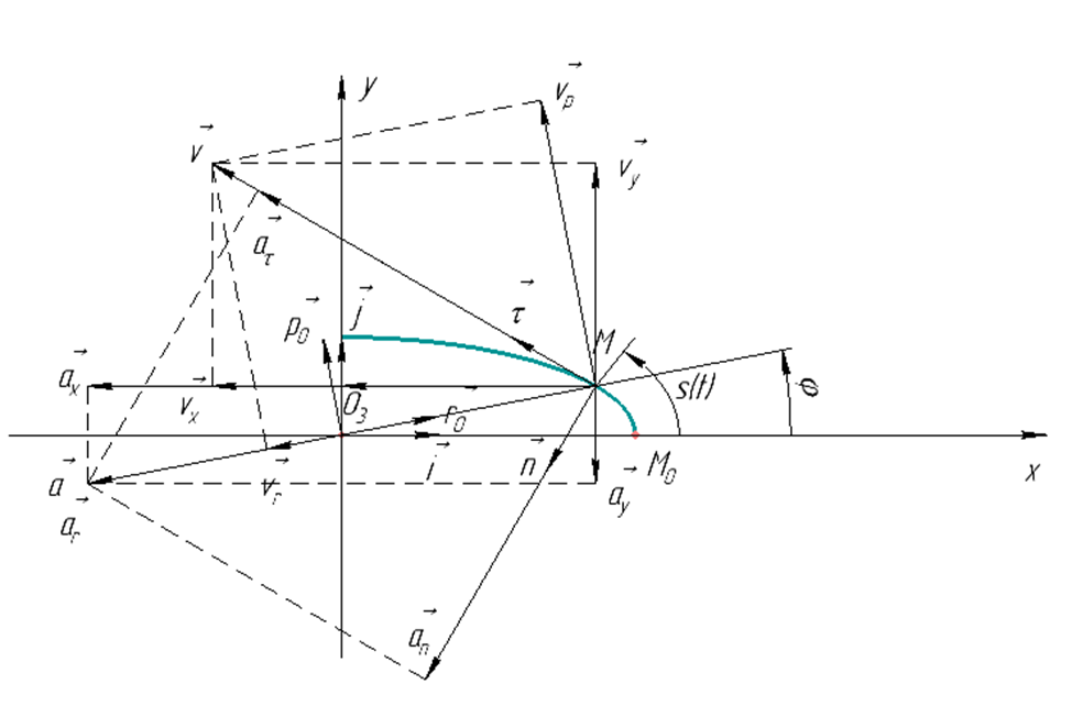 6) найти радиальные и трансверсальные составляющие скорости и ускорения точки M. Начало полярной системы координат нужно поместить в начало декартовой, направив полярную ось по оси Ox;
