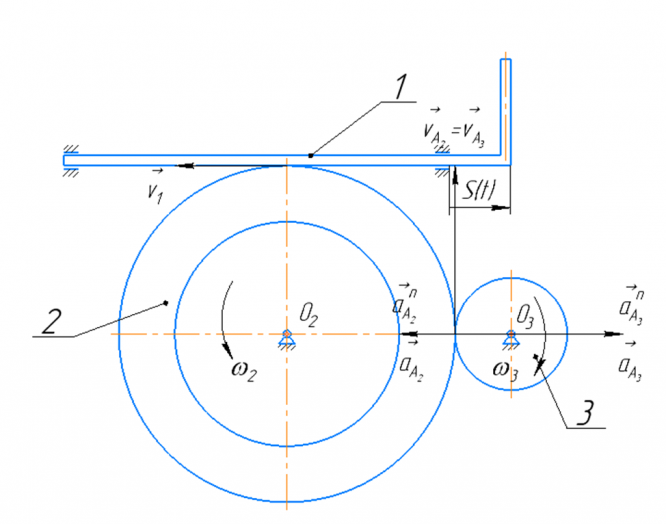 4) для точек контакта тел Ai (i - номер звена) определить скорости, ускорения и изобразить их на схеме механизма в соответствующем масштабе (см.разд. 4).