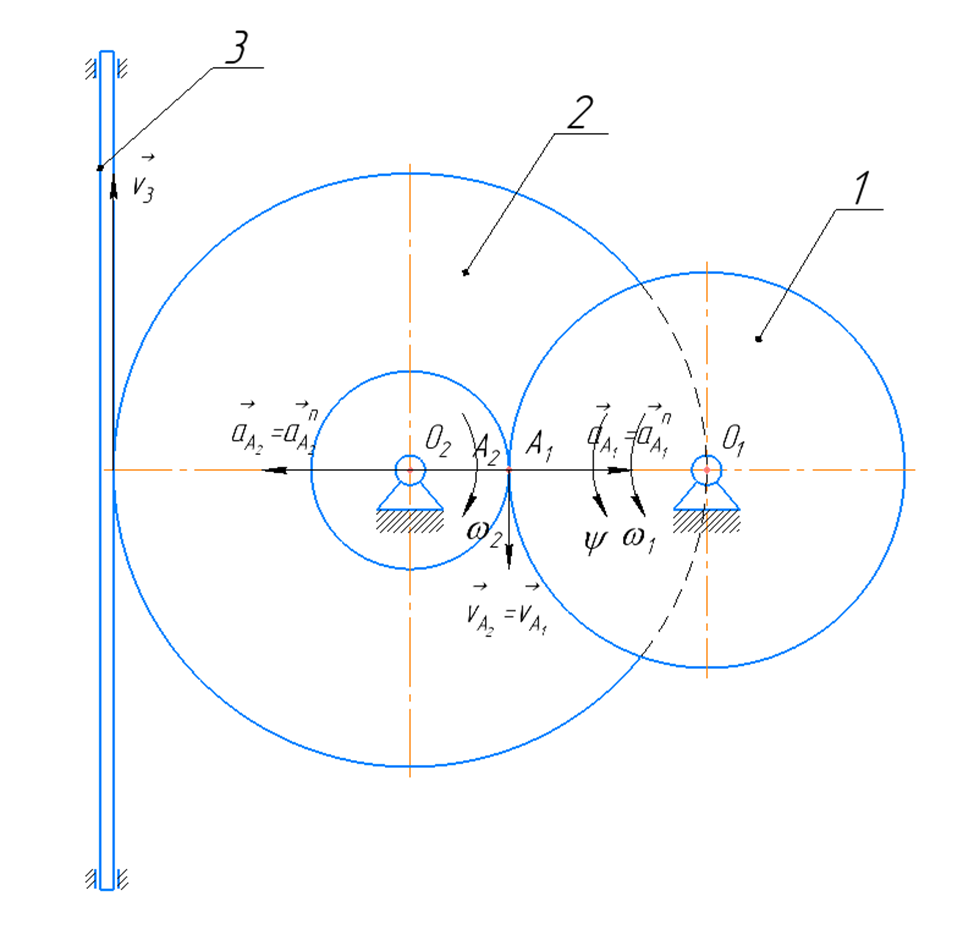 4) для точек контакта тел Ai (i - номер звена) определить скорости, ускорения и изобразить их на схеме механизма в соответствующем масштабе (см.разд. 4).