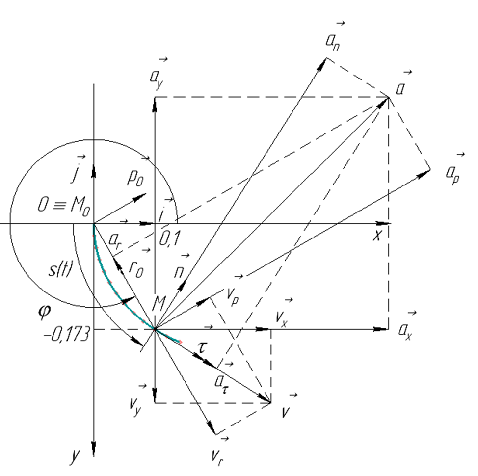 7) в выбранном масштабе выполнить чертеж с изображением траектории движения точки M. На чертеже указать все составляющие скорости и ускорения точки M в момент времени