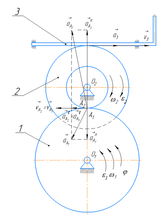4) для точек контакта тел Ai (i - номер звена) определить скорости, ускорения и изобразить их на схеме механизма в соответствующем масштабе (см.разд. 4).