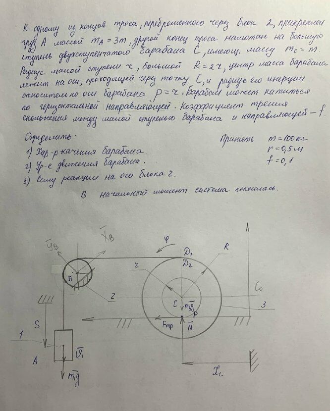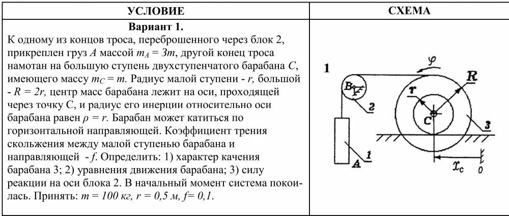 Вариант 1. К одному из концов троса, переброшенного через блок 2, прикреплен груз А массой тA = Зm, другой конец троса намотан на большую ступень двухступенчатого барабана С, имеющего массу тC = т. Радиус малой ступени - r, большой - R = 2r, центр масс барабана лежит на оси, проходящей через точку С, и радиус его инерции относительно оси барабана равен ρ = r. Барабан может катиться по горизонтальной направляющей. Коэффициент трения скольжения между малой ступенью барабана и направляющей - f. Определить: 1) характер качения барабана 3; 2) уравнения движения барабана; 3) силу реакции на оси блока 2. В начальный момент система покоилась. Принять: т = 100 кг, r = 0,5 м, f= 0,1.