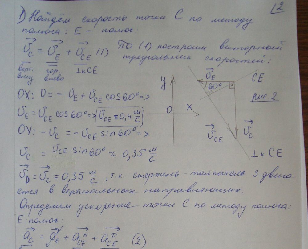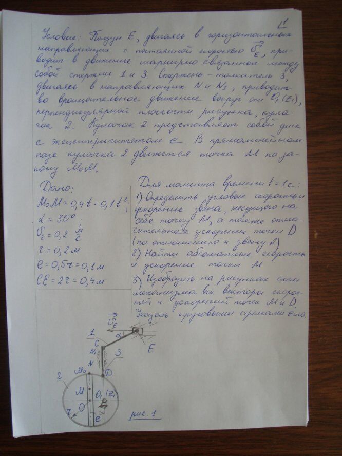 Вариант 10. Ползун E, двигаясь в горизонтальных направляющих с постоянной скоростью VE , приводит в движение шарнирно связанные между собой стержни 1 и 3. Стержень - толкатель 3, двигаясь в направляющих N и N1, приводит во вращательное движение вокруг оси O1(z1), перпендикулярной плоскости рисунка, кулачок 2. Кулачок 2 представляет собой диск с эксцентриситетом е. В прямолинейном пазе кулачка 2 движется точка М по закону M0M = 0,4t -0,1t 2 . Принять α = 30°, VE =0,2 м/с, r = 0,2 м, е=0,5r, СЕ=2r. Для момента времени t = 1 c определить: 1) угловые скорость и ускорение звена, несущего на себе точку М, а также относительное ускорение точки D (по отношению к звену 2); 2) абсолютные скорость и ускорение точки M.