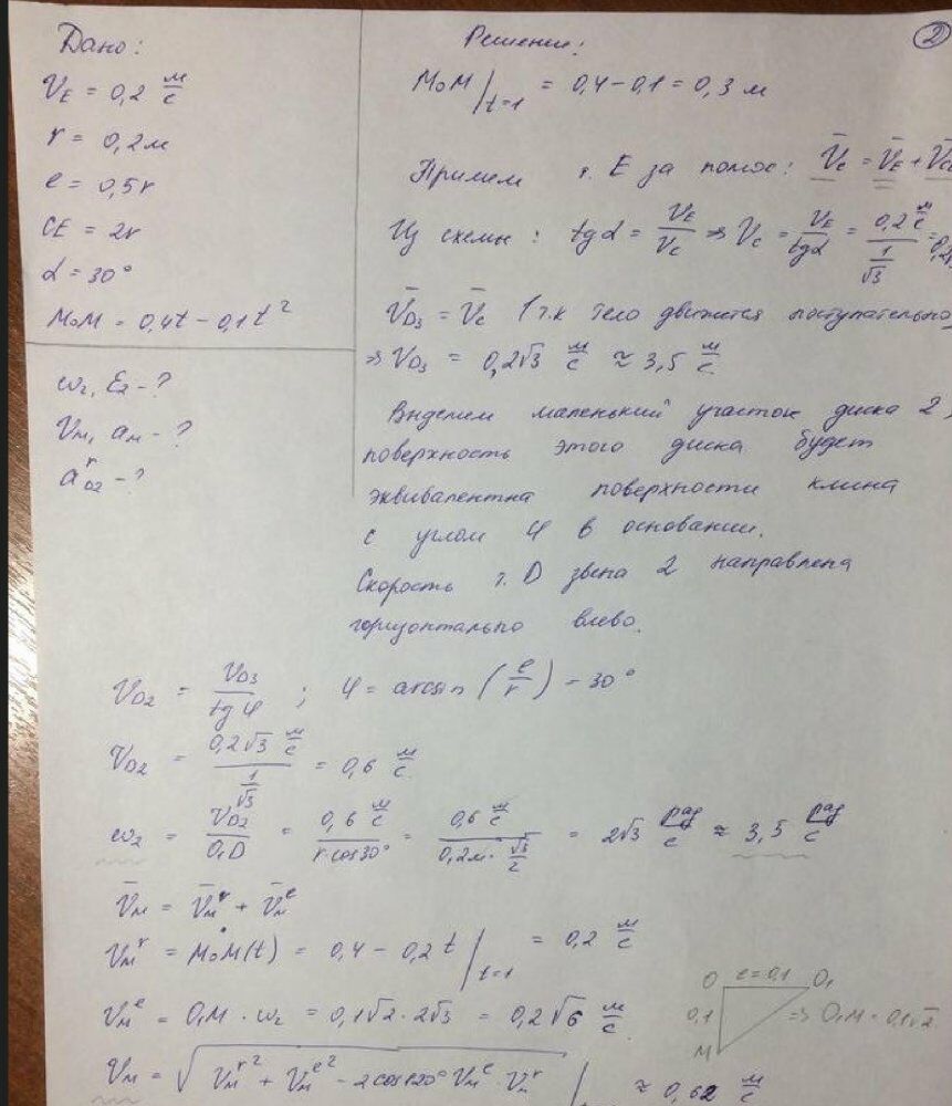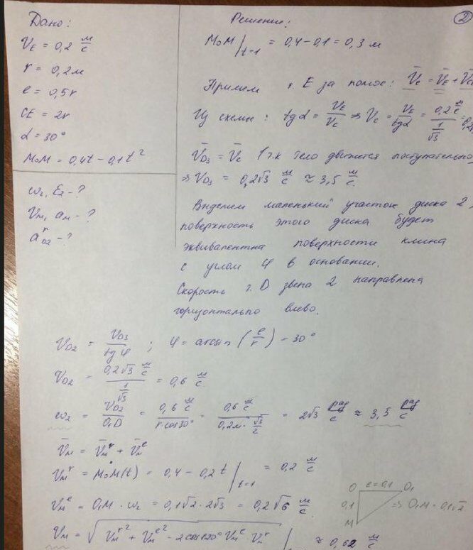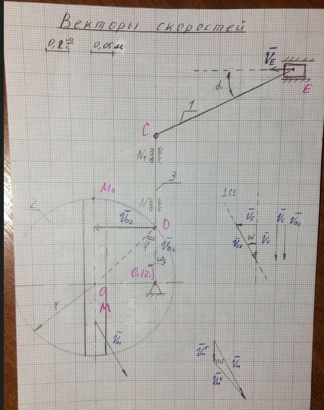Вариант 10. Ползун E, двигаясь в горизонтальных направляющих с постоянной скоростью VE , приводит в движение шарнирно связанные между собой стержни 1 и 3. Стержень - толкатель 3, двигаясь в направляющих N и N1, приводит во вращательное движение вокруг оси O1(z1), перпендикулярной плоскости рисунка, кулачок 2. Кулачок 2 представляет собой диск с эксцентриситетом е. В прямолинейном пазе кулачка 2 движется точка М по закону M0M = 0,4t -0,1t 2 . Принять α = 30°, VE =0,2 м/с, r = 0,2 м, е=0,5r, СЕ=2r. Для момента времени t = 1 c определить: 1) угловые скорость и ускорение звена, несущего на себе точку М, а также относительное ускорение точки D (по отношению к звену 2); 2) абсолютные скорость и ускорение точки M.